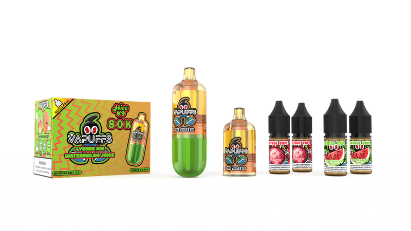 Home » Products » Vapuffs Juicy V9 80k » 2025 New Design EU Warehouse Vapuffs Juicy V9 80k Puffs Disposable Refillables Kits Pods +4 E-liuqid High Quality Vape-Lychee Ice / Watermelon Juice