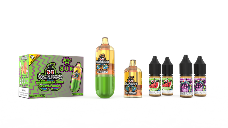 Home » Products » Vapuffs Juicy V9 80k » 2025 New Design EU Warehouse Vapuffs Juicy V9 80k Puffs Disposable Refillables Kits Pods +4 E-liuqid High Quality Vape-Watermelon Juice / Crystal Grape